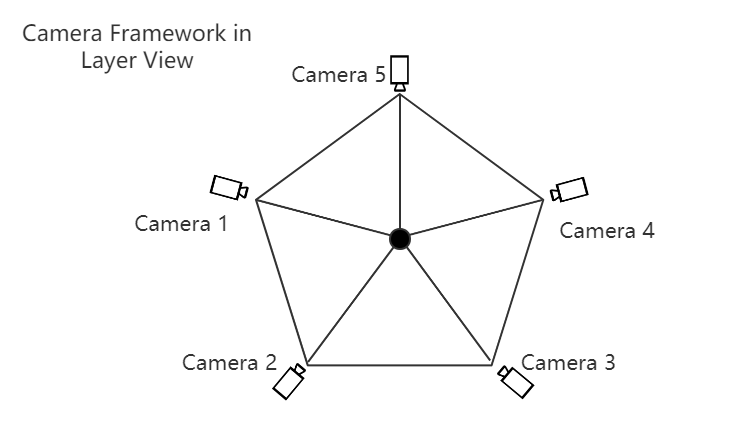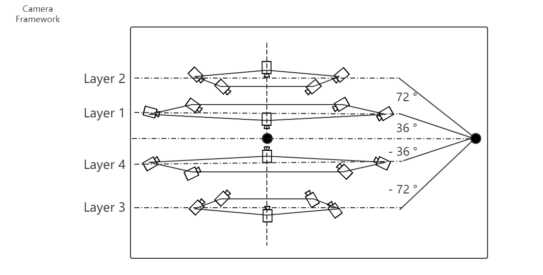 4 layers framework, the included angle with ground is set to +36, +72, -36, -72. All cameras towards to the origin(Object).